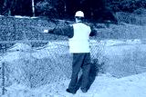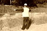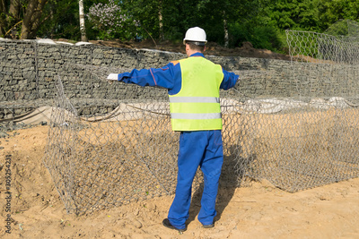 a worker spreads a protective net to strengthen the soil with gloves and a helmet