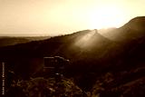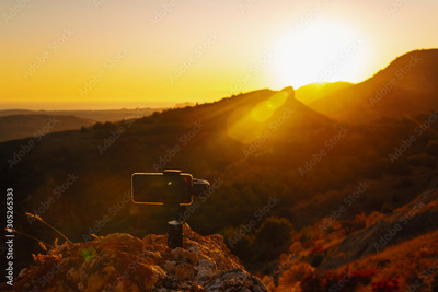 Monopod stabilizer for a mobile phone in the mountains at sunset