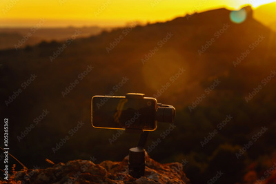 Monopod stabilizer for a mobile phone in the mountains at sunset