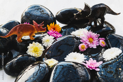 Wet black stones with chrysanthemum buds and small toy dinosaurs, decor for spa, relaxation and massage
