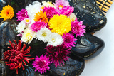 Wet black stones with chrysanthemum buds, decor for spa, relaxation and massage