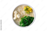 Poke with tofu, avocado and Chuka in white deep dish isolated on white background.