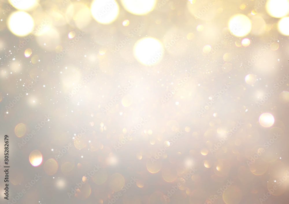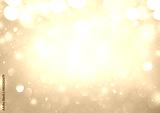 Christmas glowing Golden Background. Christmas lights. Gold Holiday New year Abstract Glitter Defocused Background With Blinking Stars and sparks. Blurred Xmas Bokeh. Greeting card art design