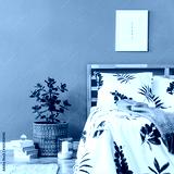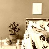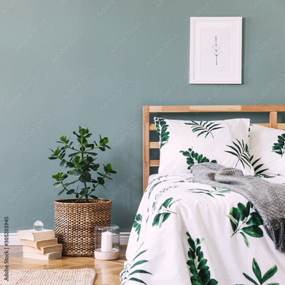 Minimalistic composition of bedroom interior with wooden bed, mock up poster frame, rattan basket, plants, books and elegant accessories. Beautiful bed sheets, blanket and pillow. Template. Home decor