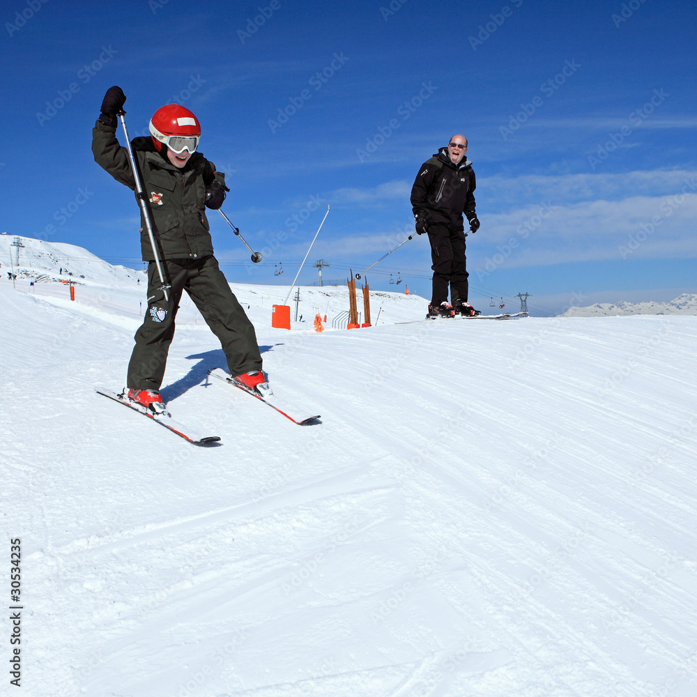 Sport d'hiver en famille : Père et fils skiant ensemble