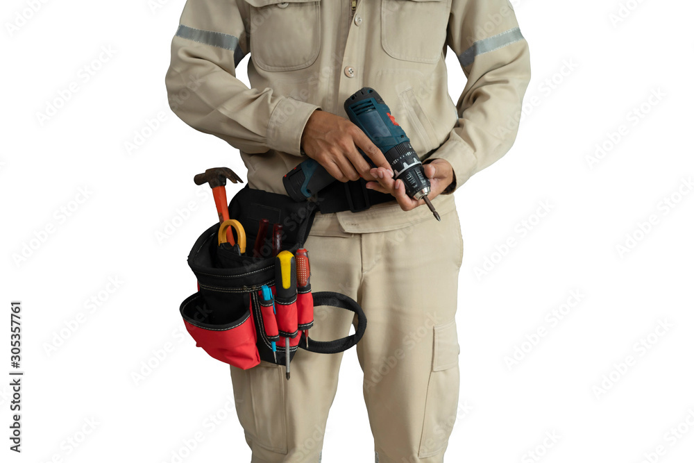 Close-up electrician uniform Hand electric drill with tool belt isolated on white background
