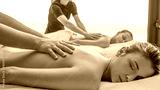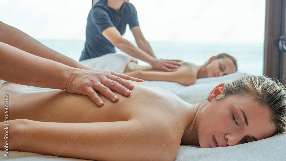 Close up of two young girlfriends are receiving a back massage and spa treatment in a luxury wellness center.