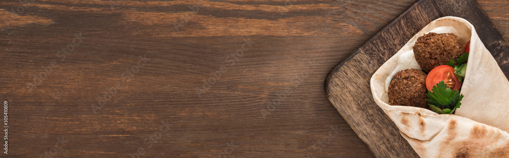 top view of falafel with vegetables and sauce in pita on wooden table, panoramic shot