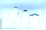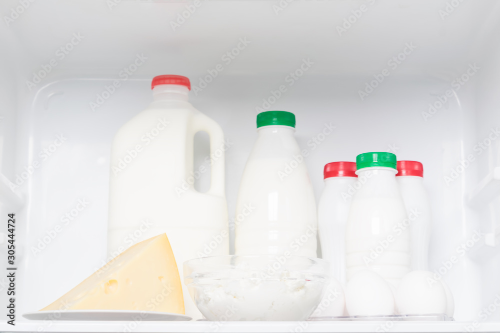 some white bottles and a piece of cheese on the top shelf in the refrigerator