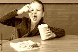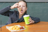girl eating potatoes with ketchup and drinking tea from a paper cup