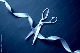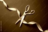 Grand opening. Gold scissors cutting gold satin ribbon, black background