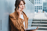 Young stylish businesswoman in coat thoughtfully talking on cellphone working on laptop on street