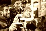 Friends drinking beer at brewery bar outdoor on winter time - Friendship concept with young people having fun together toasting at happy hour promotion - Focus on girl with pink hat - Warm neon filter