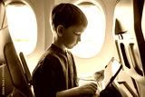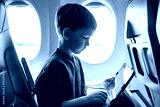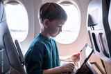 Cute six years old boy, playing on tablen in aircraft on boar, traveling on vacation with parents and siblings