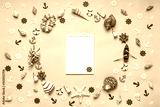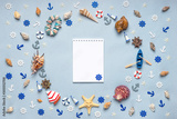 Round frame made of decorative items and miniature toys: seashells, seastars, vessel, boat, anchors, steering wheels, life buoys. White notebook page, mock up. Summer vacation, sea travel concept