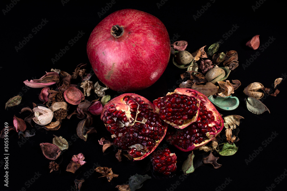 ripe pomegranate rustic style on black isolated background still life