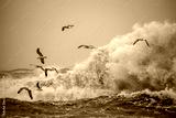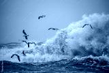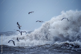 Huge waves raging in the sea and seagulls in the spray of waves. Storm at sea. Black Sea. Odessa.