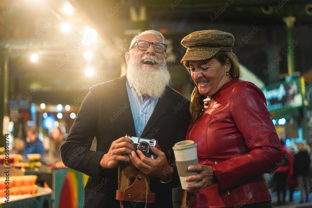 Happy senior couple having fun together taking ph otos in street food market - Fashion wife and husband making a city tour in London - Travel and joyful elderly lifestyle concept - Focus on man face