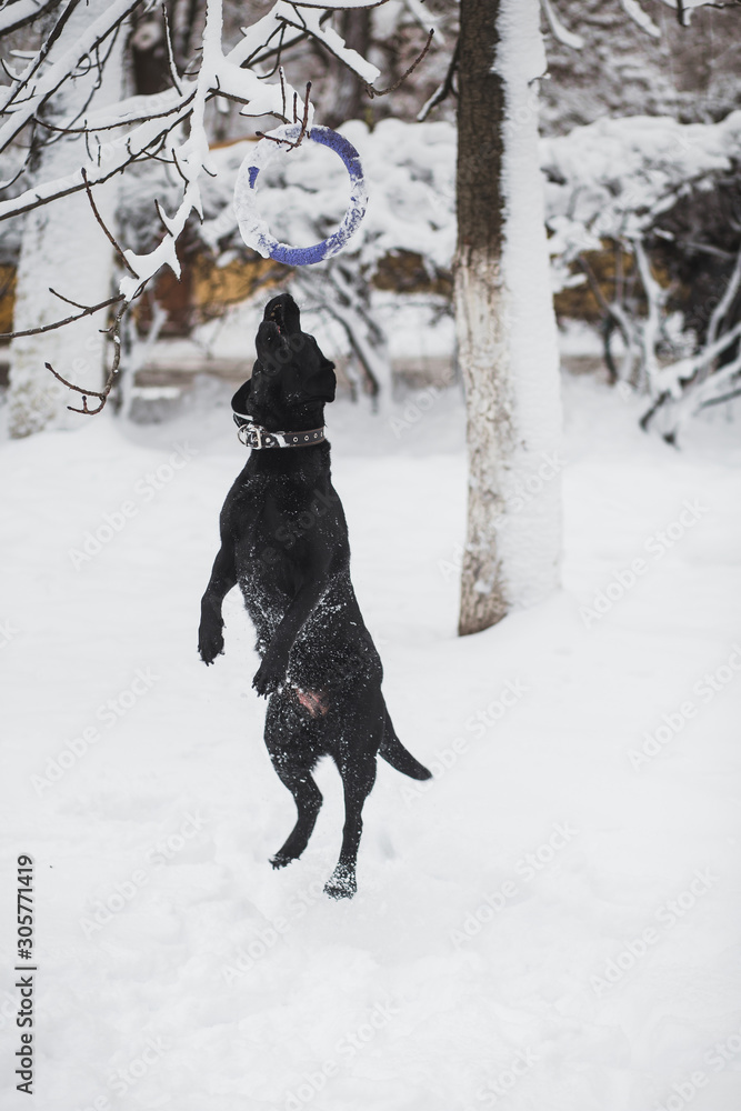Happy black healthy labrador playing in winter snowy park outdoor. Vertical color photography.