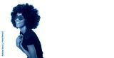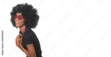 Smiling afro girl in red glasses and black shirt isolated on white background.