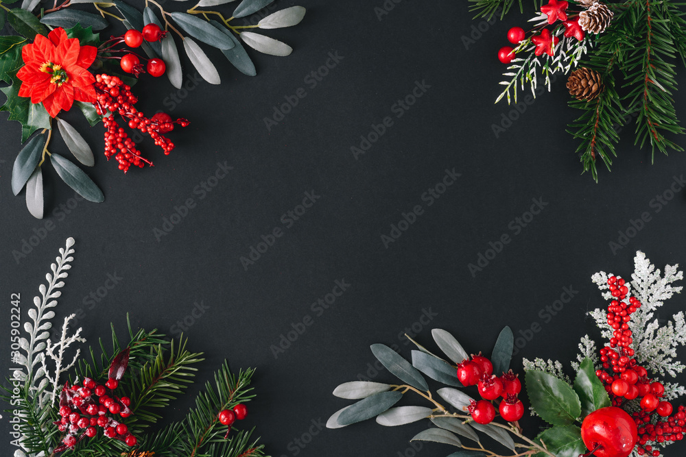 Christmas dark background made of natural winter things. Flat lay border frame with copy space.