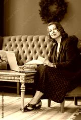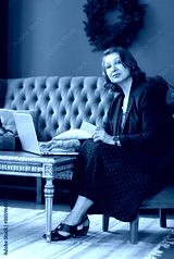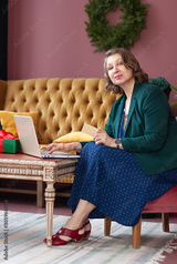 Mature woman is looking into camera and using a laptop to buy online with a credit card gifts for Christmas and New Year her family near spruce tree in the festive interior.