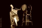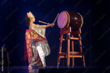 Traditional Japanese performance. Actress in white traditional japanese stage costume komono and fox mask hits the big taiko drum.