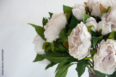 A bouquet of beautiful delicate peonies on a light pastel background, for all women.