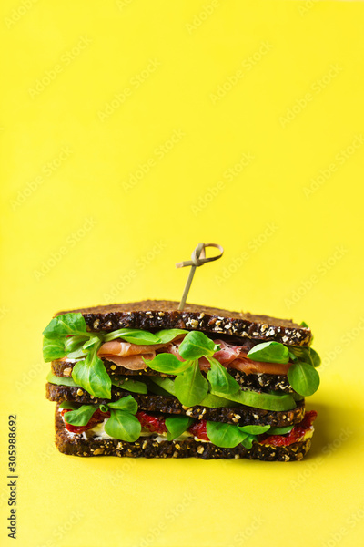 Fresh rye bread sandwich with ham, lettuce and tomato