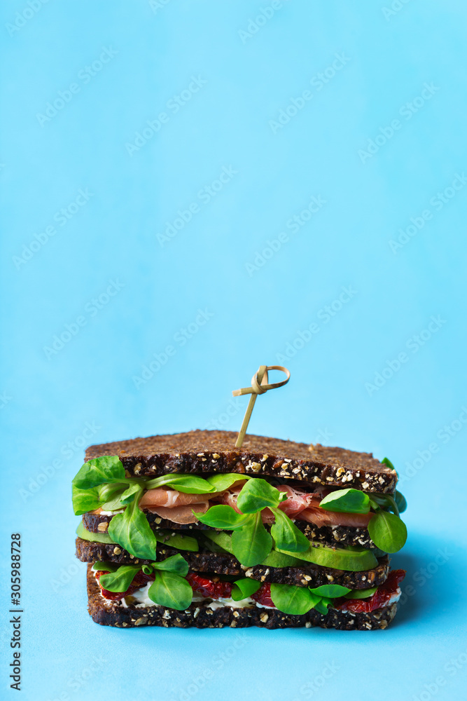 Fresh rye bread sandwich with ham, lettuce and tomato