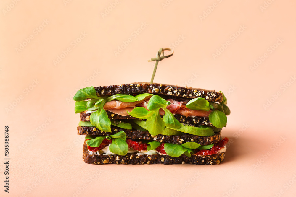 Fresh rye bread sandwich with ham, lettuce and tomato