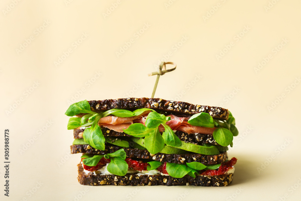 Fresh rye bread sandwich with ham, lettuce and tomato