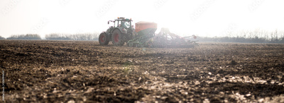 Farmer with tractor seeding, sowing crops at agricultural fields