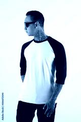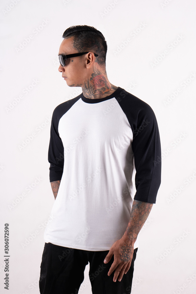 Young hipster man with tattoo wearing sunglasses standing while posing. Ready for your mock up template design or background. Young man wearing raglan 3/4 sleeve t shirt isolated on white background.