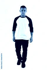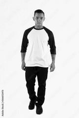 Black man tattooed wearing black and white raglan 3/4 sleeve posing isolated on white background