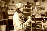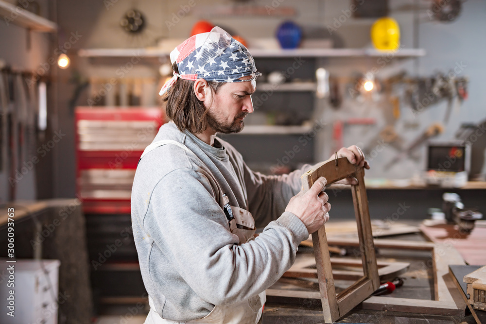 Carpenter working on the old wood in a retro vintage workshop.