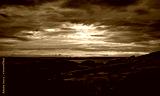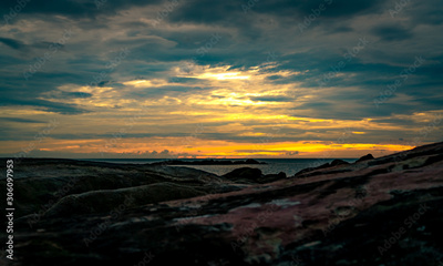Beautiful stone beach in the morning with golden sunrise sky. Peaceful and tranquil scene. Landscape of calm sea in the morning. Seascape with skyline. Tropical sea. Beauty in nature. Rock beach.