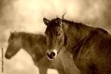 Horse herd in motion on winter snow landscape at sunset