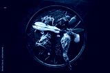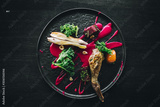 Michelin restaurant serving organic duck meat with kale and Beet puree on dark plate, chef cooking food