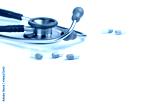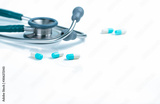 Stethoscope and blue-white capsule pills on doctor table or nurse desk. Health checkup. Medical healthcare and medicine background. Physician tool for patient diagnosis. Cardiology doctor equipment.