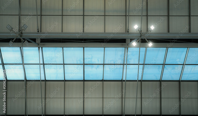 Roof and glass skylights of the airport. Interior architecture design. Skylights with lamp light. Modern building roof structure. Saving energy and eco friendly building. LED lamp light on ceiling.