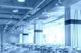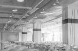 Empty chair and table in the room. Air duct, air conditioner pipe, wiring pipe, and fire sprinkler system. Air flow and ventilation system. Building interior. Ceiling lamp light. Interior architecture