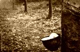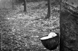 Rubber tree plantation. Rubber tapping in rubber tree garden in Thailand. Natural latex extracted from para rubber plant. Latex collect in plastic cup. Latex raw material. Hevea brasiliensis forest.