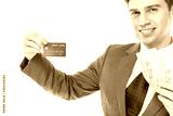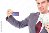 Businessman showing credit card, cash or money with satisfied customer, smiley face. Young Caucasian guy use credit card instead cash when he shopping. It is safe and fee. isolated on white background