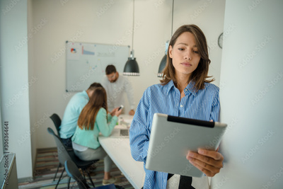 Young woman using tablet. In modern office team people work on new project