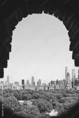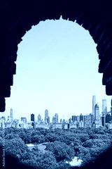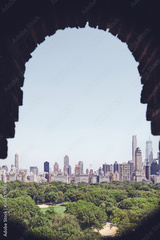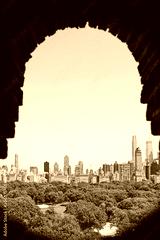 Central Park and Manhattan Upper East Side seen through brick frame, color toning applied, New York, USA.