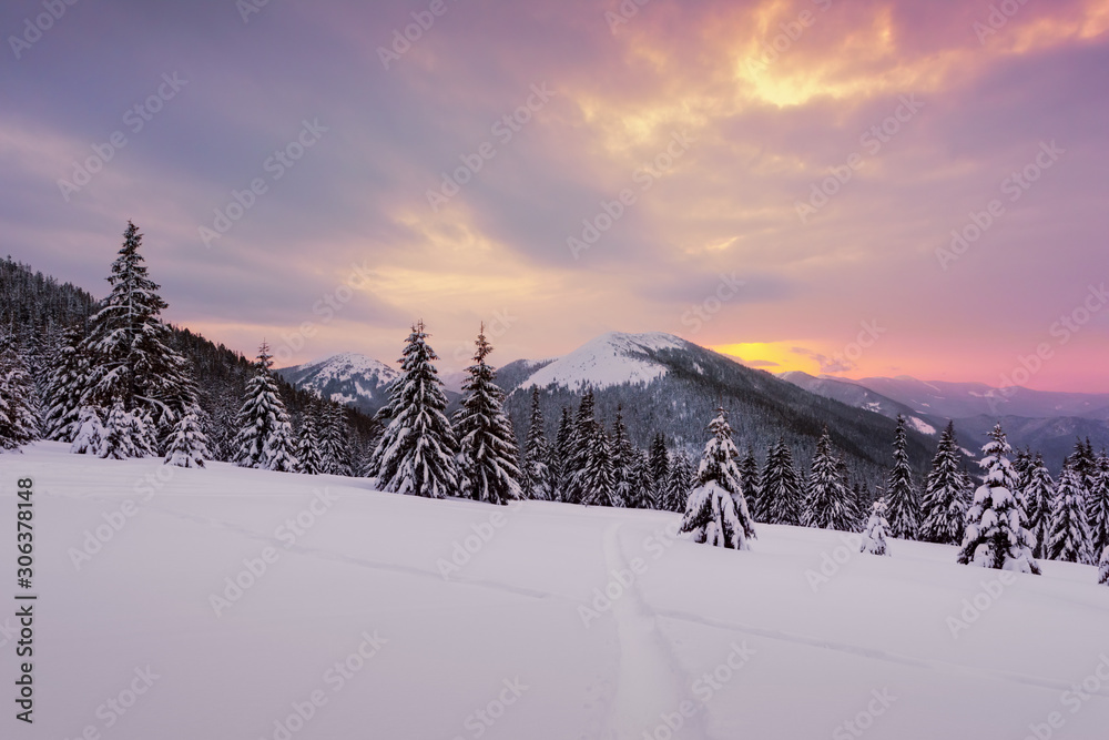 Fantastic orange winter landscape in snowy mountains glowing by sunlight. Dramatic wintry scene with snowy trees. Christmas holiday background