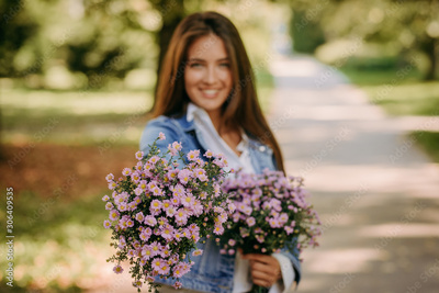 Beautiful woman in park with bouquet of flowers