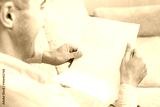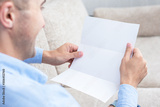Man reading a letter at the couch, men's hands, close up, rear view, copy space, toned