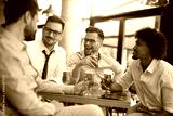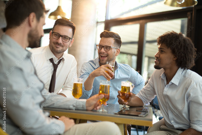 Funny conversation four businessmen while sit pub and drinking beer after work